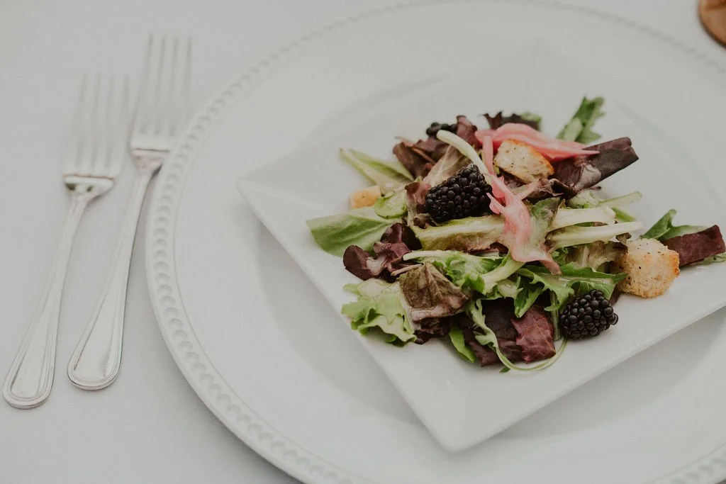 Blackberry Champagne Vinaigrette salad with Chevre, Pickled Red Onion & Handmade Croutons