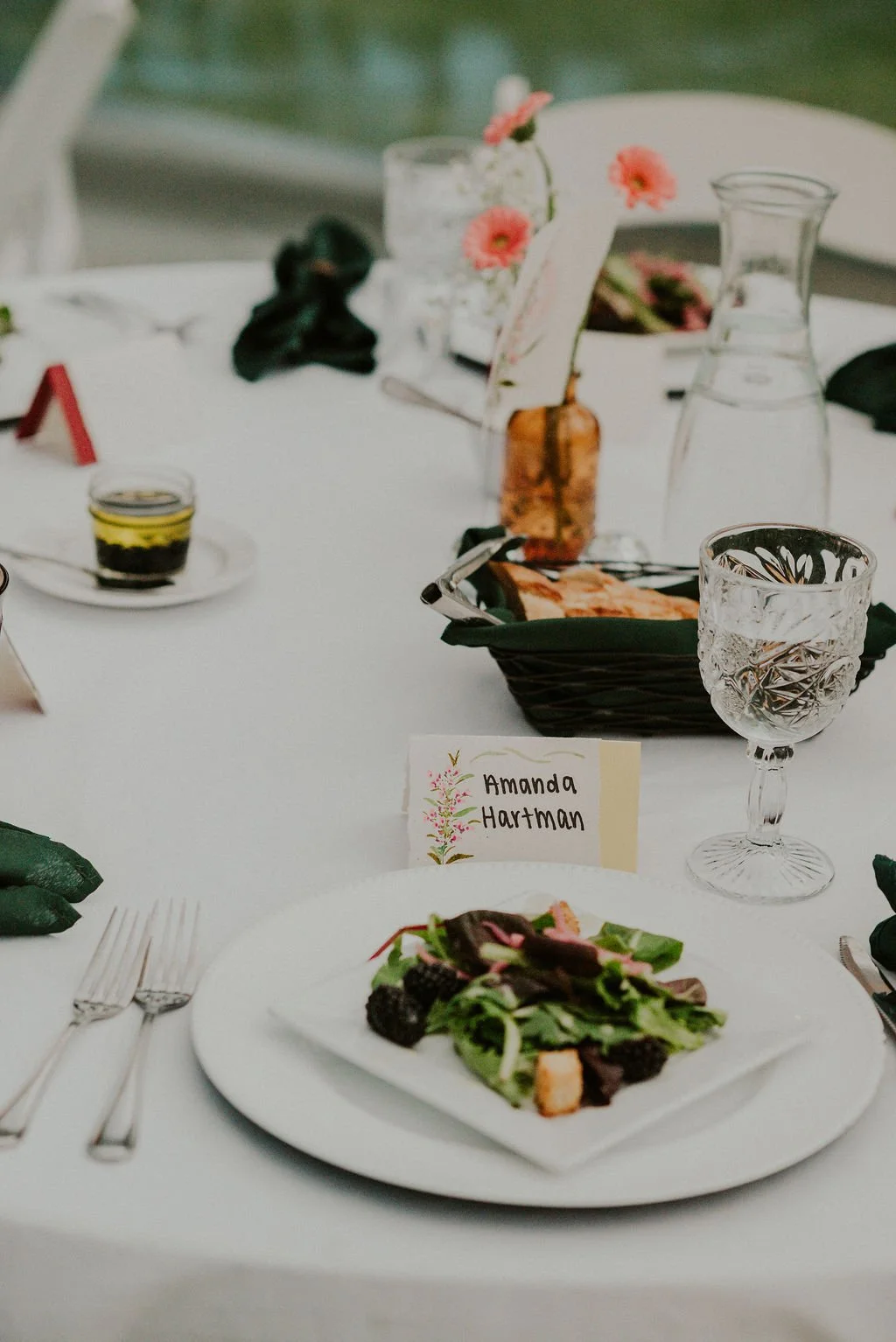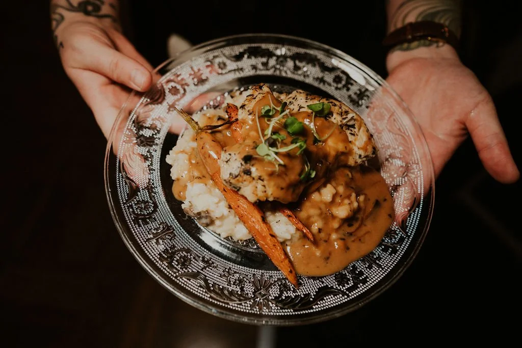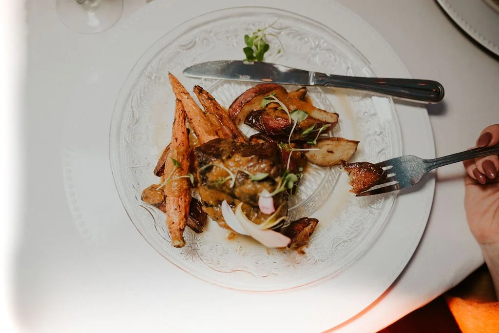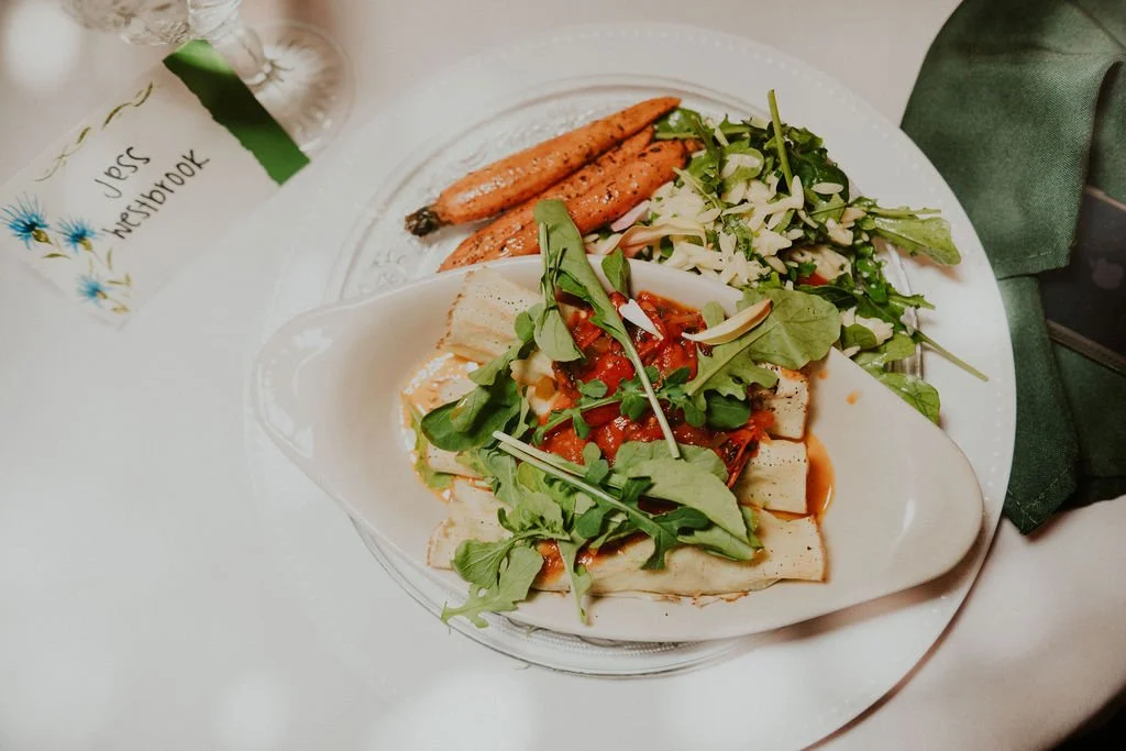 To complement the scenery, guests were treated to a curated PNW plated dinner, beginning with a fresh salad dressed in blackberry champagne vinaigrette with chèvre, pickled red onion, and handmade croutons. The menu featured a rich and flavorful selection, including savory crepes filled with pesto-infused ricotta, tomato jam, wild mushroom duxelle, and arugula, alongside a bright lemon chive orzo salad with goat cheese.