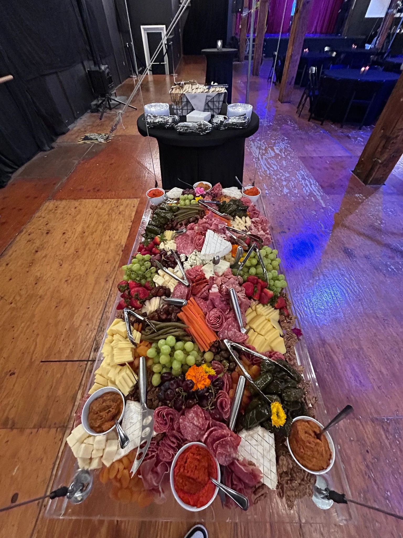 An Elegant Display of: Assorted cheeses, House-cured Meats, Seasonal fresh and Dried Fruit, Vanilla-Chipotle Spiced Pecans, Herb Roasted Olives, Pike Place Market Marinated Vegetables, Homemade Tapenades, Hand Rolled Vegetarian Dolmas, Rustic Rosemary Cracker Bread, Warm French baguettes, Garnished with Homegrown Herbs and Edible Flowers